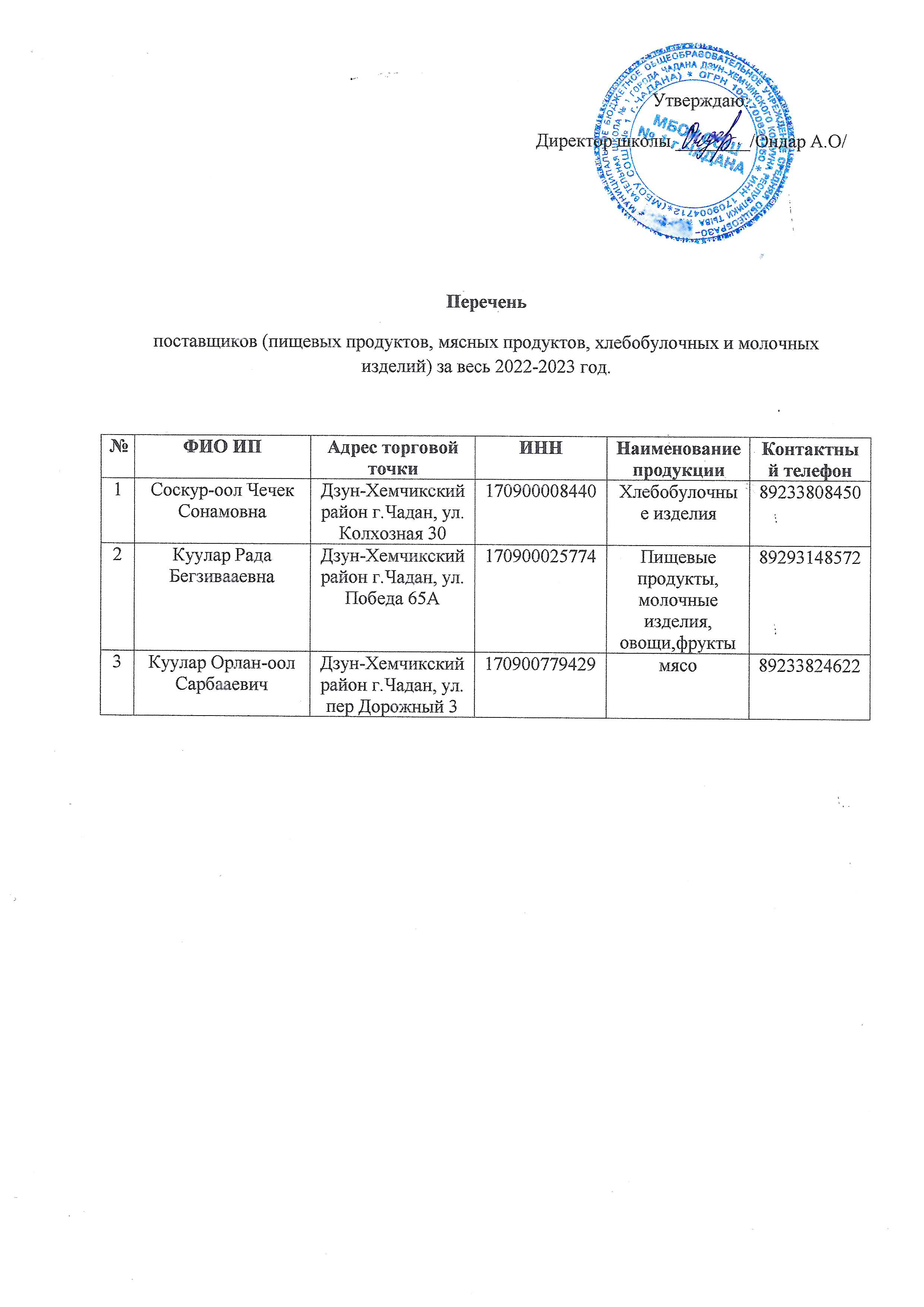 ИП Куулар Рада Бегзивааевна, контактный тел: +7(923)-314-85-72. Адрес: 668111, Дзун-Хемчикский район, г. Чадан, ул. Победа 65А, поставляет продукты питания