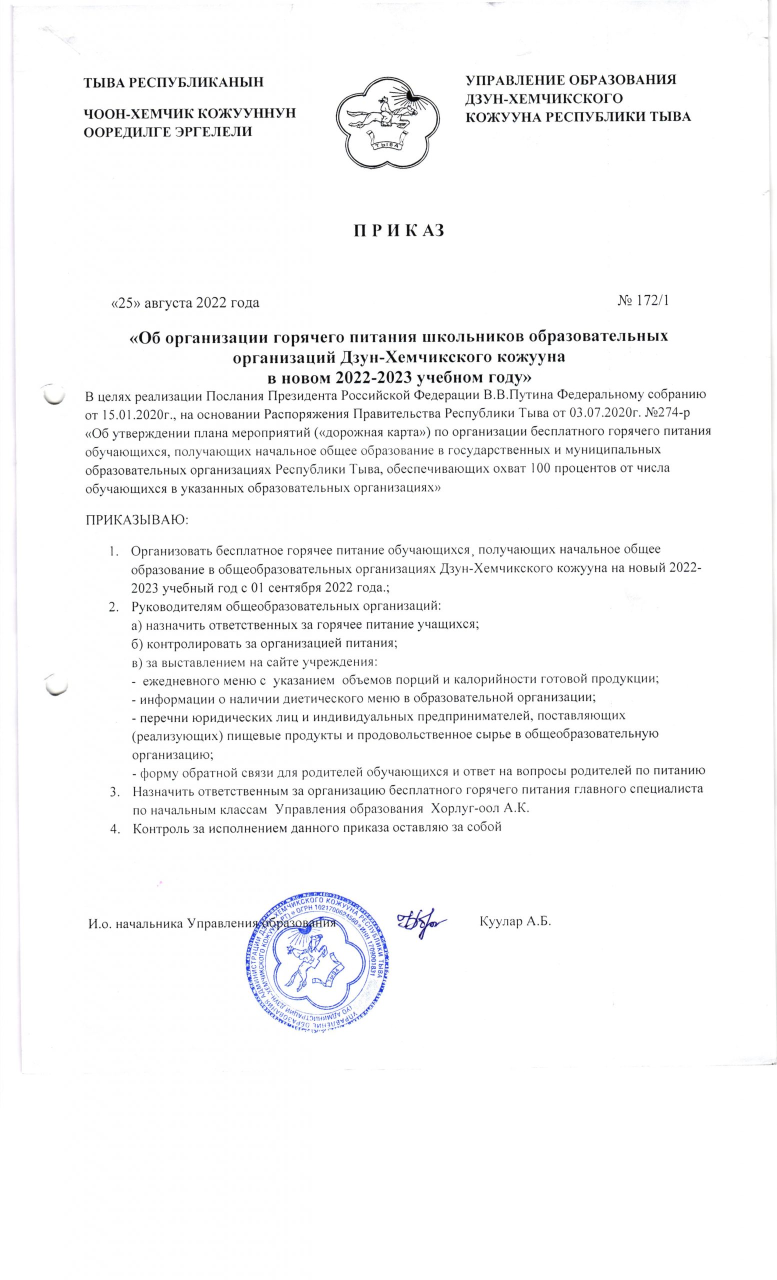 - Приказ о назначении ответственного за предоставления сведений об обеспечении бесплатным горячим питанием учащихся
